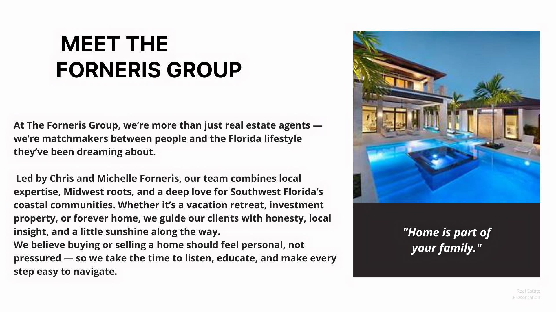 To redefine what it means to live - and thrive in Southwest Florida. We envision a community where every home purchase sparks connection, every client becomes a neighbor, and every relationship helps strengthen the place we all love to call home.
